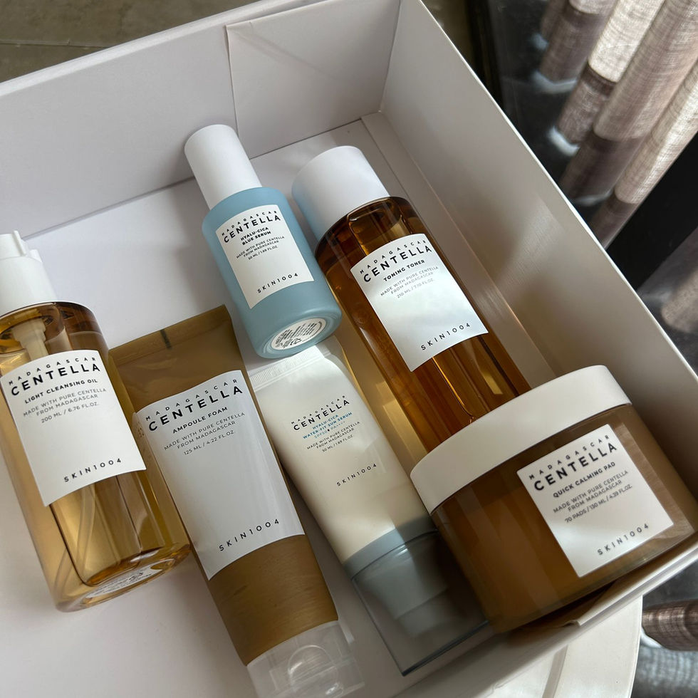 המארז כולל את כל שלבי שגרת הטיפוח מסדרת הדגל האייקונית של SKIN1004, המבוססת על סנטלה אסיאתיקה ממדגסקר – הידועה בתכונות הריפוי, ההרגעה והחיזוק שלה.
